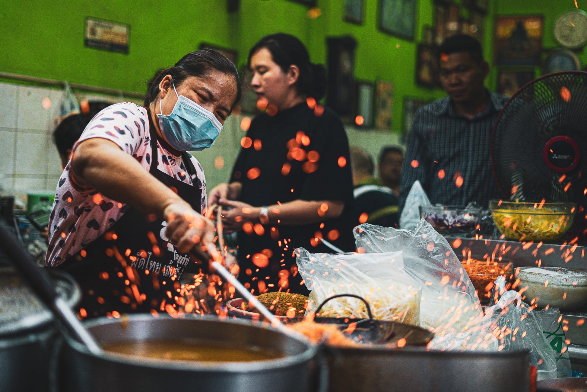 At Lueng Pha Pad Thai in Bangkok, Thailand, the vibrant street-side scene comes alive as a skilled fry cook orchestrates a culinary masterpiece. With a seasoned wok in hand, she stands amidst the sizzling chaos, mid-stir, as flames dance and sparks fly from the fiercely ignited fire below.